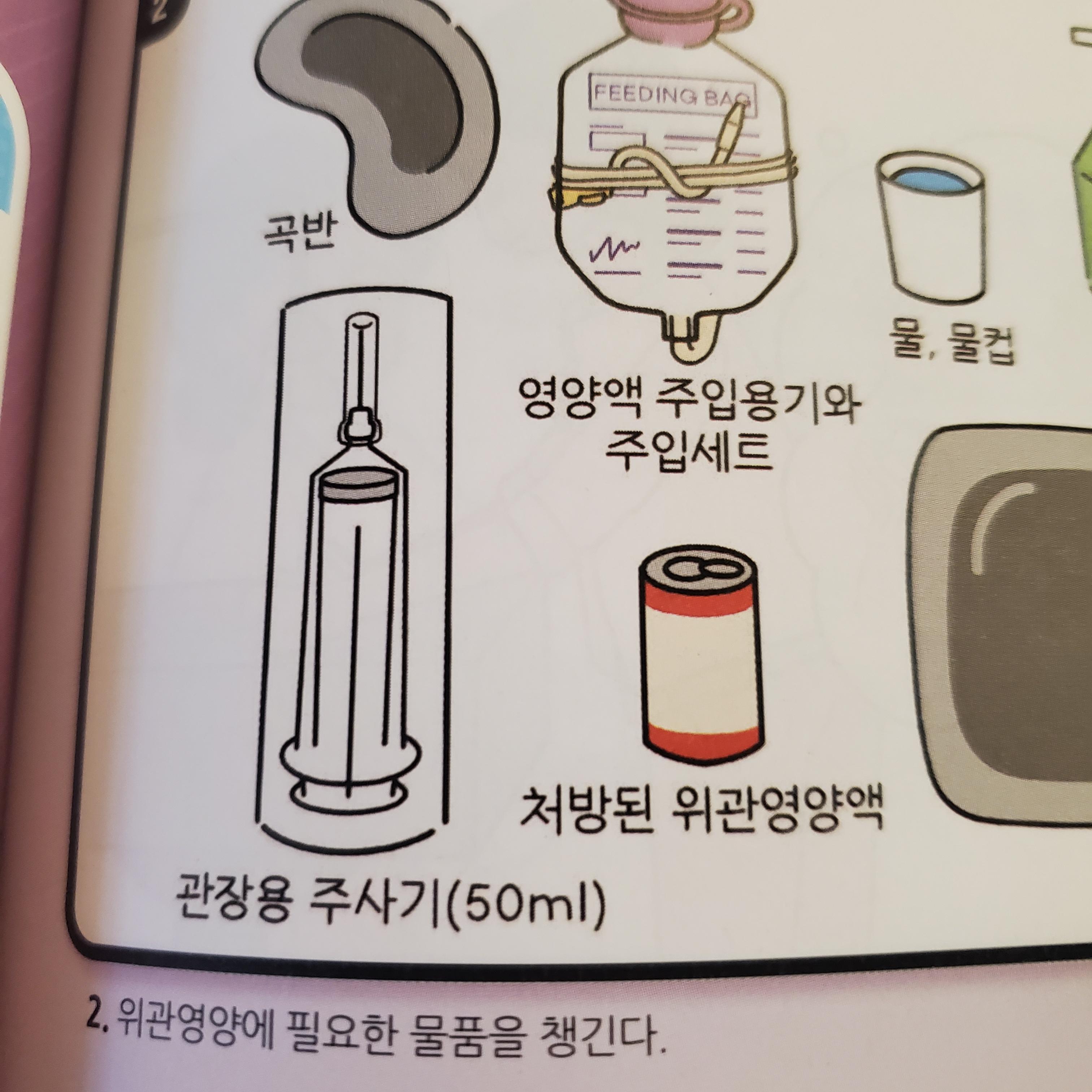 위관영양이나 관장할 때 쓰는 '관장용 주사기'를 '니들(needle)이 있는 주사기'로 그렸다는 점이에요.