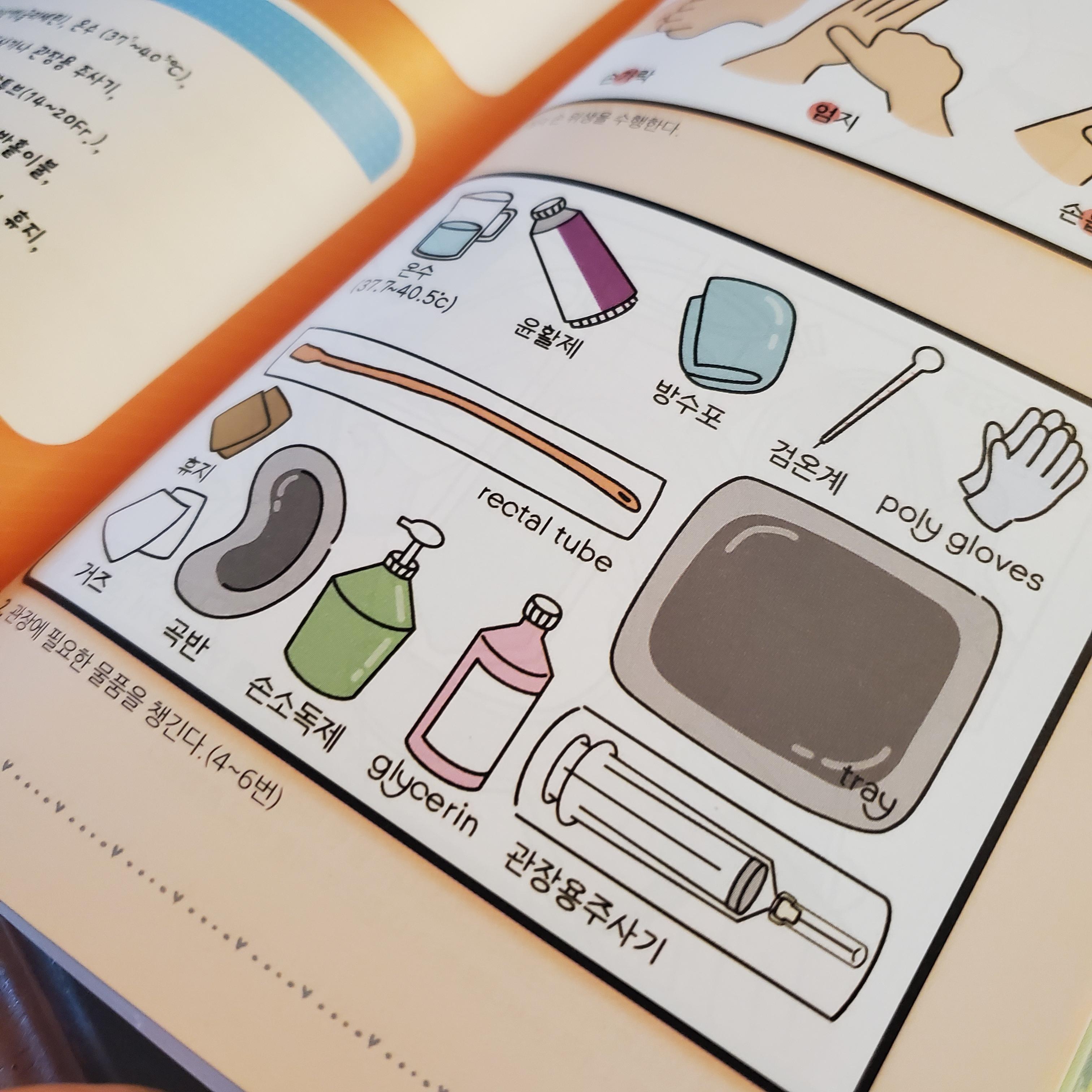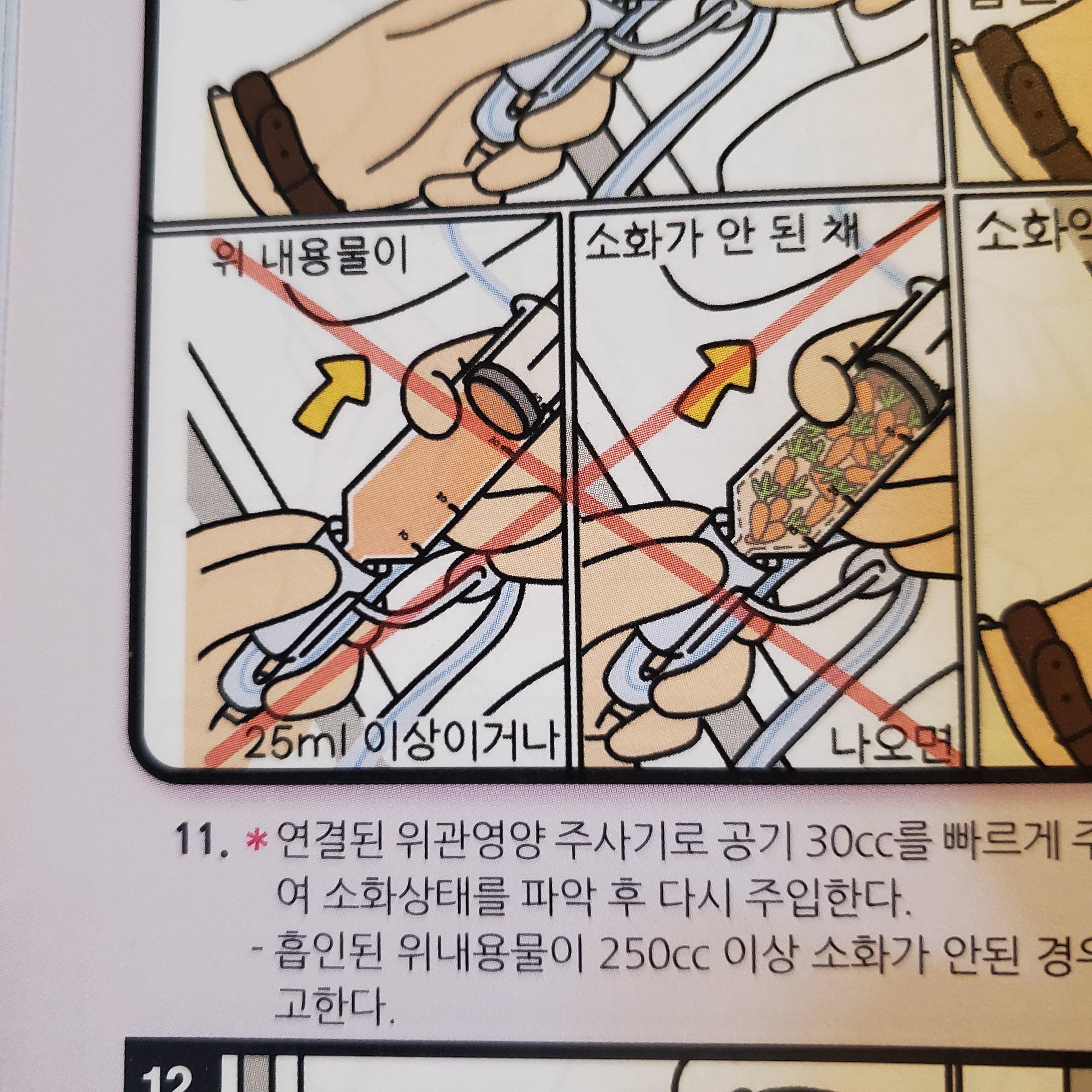 예를 들어, 위관영양 파트에서 영양액 주입 전에 소화가 되었는지 확인 위해 주사기를 당겨보는 걸(리거지하는 거) 표현한 부분(118page).