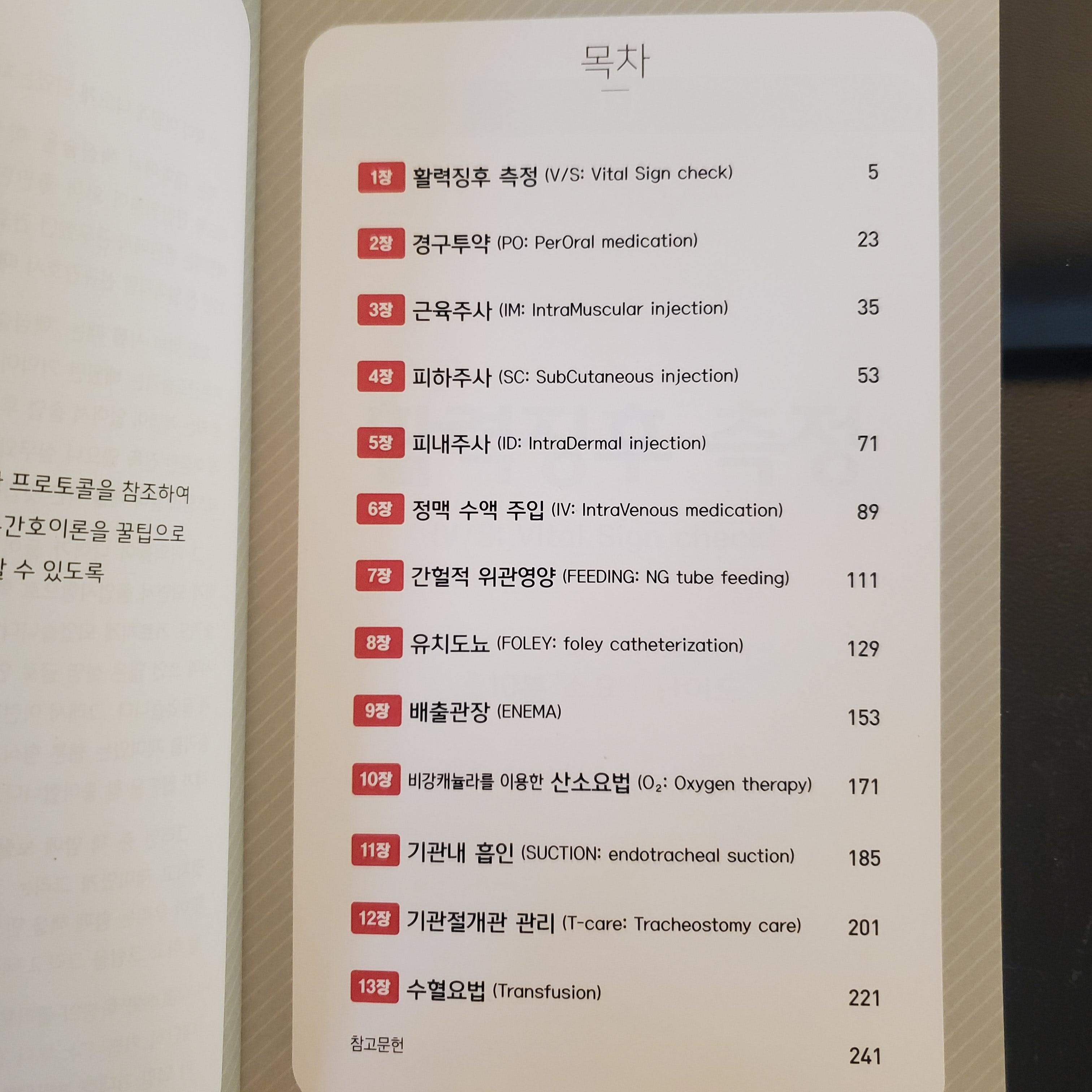활력징후 측정, 경구투약, 근육주사, 피하주사, 피내주사, 정맥 수액 주입, 간헐적 위관영양, 유치도뇨, 배출관장, (비강캐뉼라를 이용한) 산소요법, 기관내 흡인, 기관절개관 관리, 수혈요법으로 진짜 딱 임상에서 자주 시행되고 바로 써먹을 수 있는 핵심술기 위주로 정리되어 있어서 매우 효율적입니다.