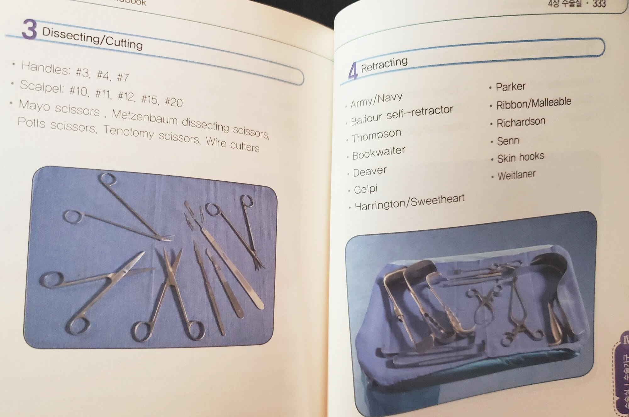 수술기구 사진이 있긴 하지만, 기구 사진 옆에 기구 하나하나의 명칭을 알 수 있게 달아놓은 것이 아니고 트레이에 놓인 여러 기구 사진 1장이 있고 기구 이름 여러 개를 사진 위나 밑에 단순히 나열해 놓은 형태인 점이 아쉬웠어요.