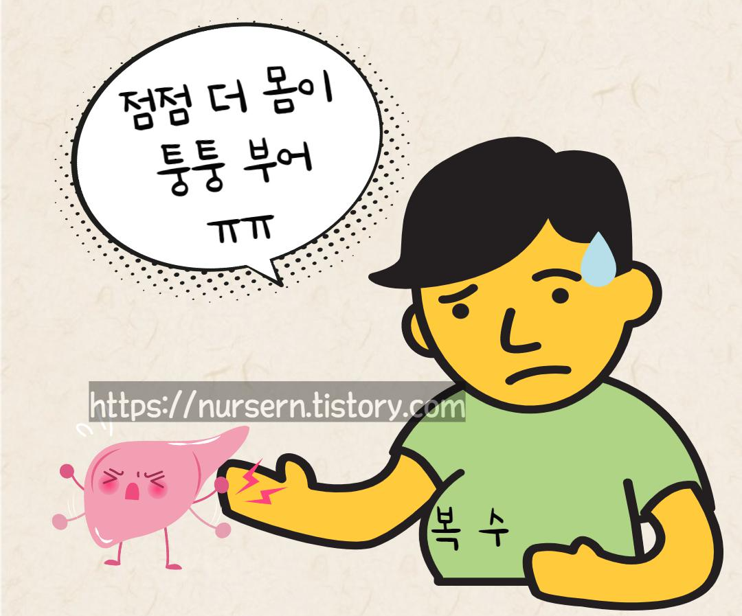 특히 복수(ascites)는 간질환이 있는 대상자에게서 자주 볼 수 있는 증상이에요.