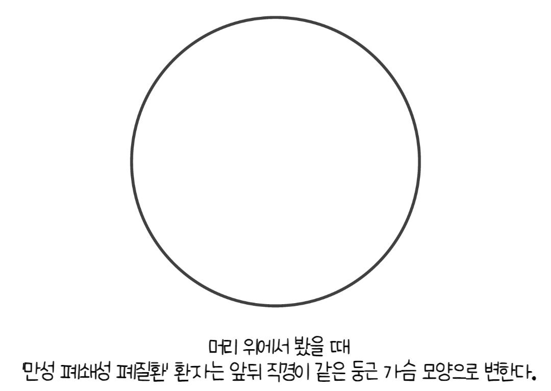 그래서 숨을 내쉴 때 공기 배출이 잘 안 되어서, 흉곽이 만성적으로 과다 팽창되어 가슴의 전, 후경이 늘어나면서 마치 술통처럼 둥글게 변합니다.