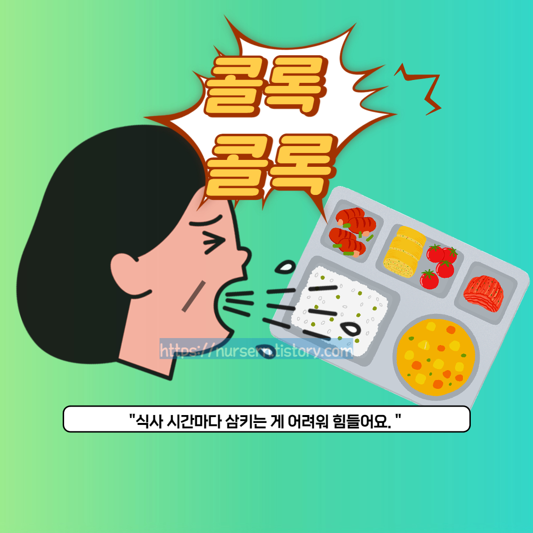 참고로 삼킴 장애가 심하면 음식 섭취 자체가 어려워질 수 있어서, 환자가 연하곤란을 호소하거나 삼키는 데 어려움을 보인다면 식사의 형태(부드러운 음식, 연식 등)를 조정하거나 추가적인 검사를 고려할 수도 있어요.