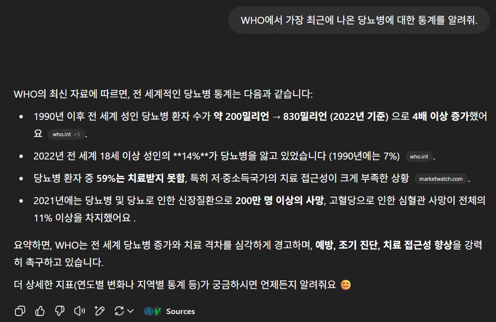 실제로 'WHO에서 가장 최근에 나온 당뇨병에 대한 통계를 알려줘. ' 라고 챗 지피티에게 물어봤더니 출처를 표시해서 잘 알려주네요!